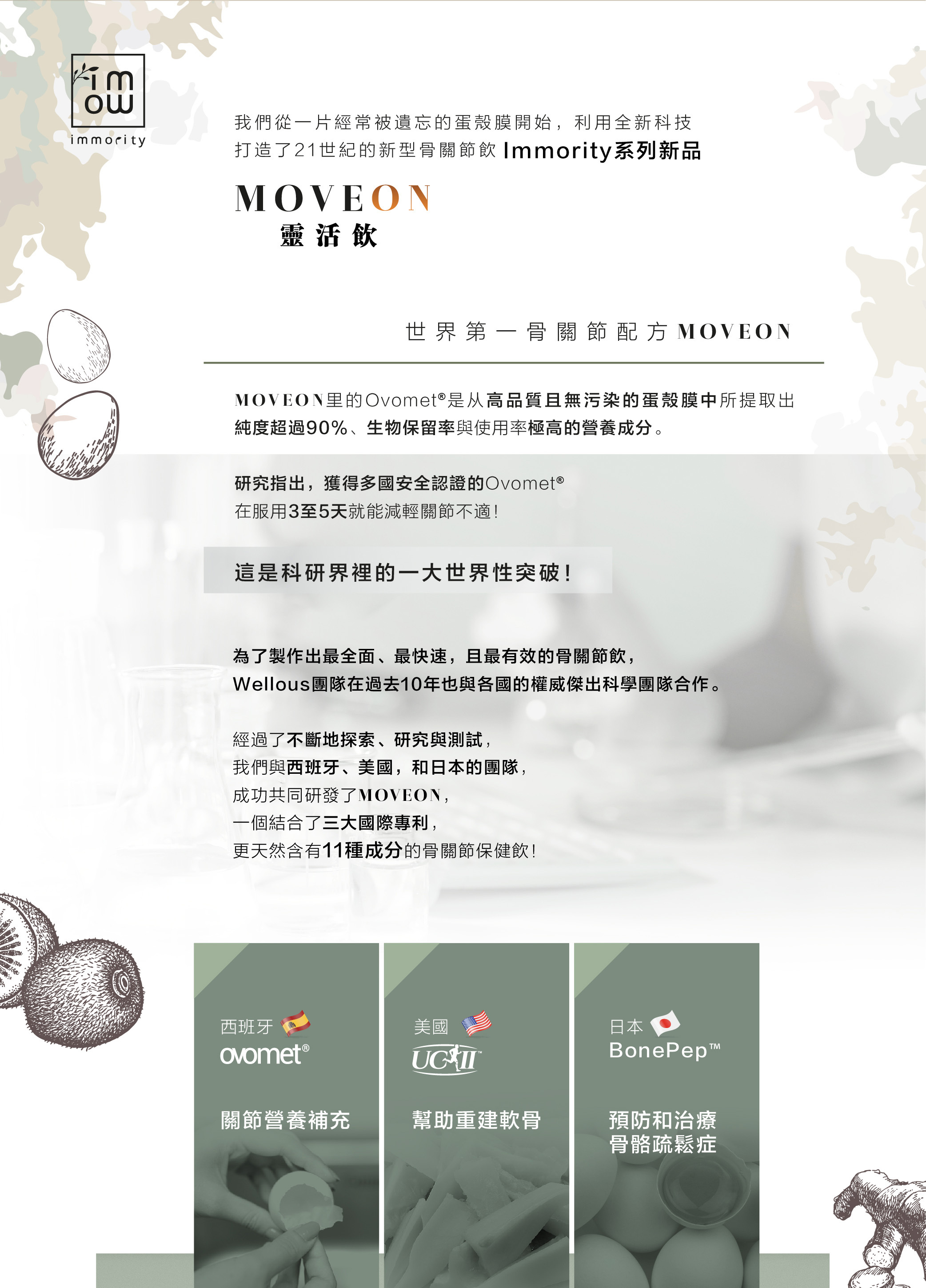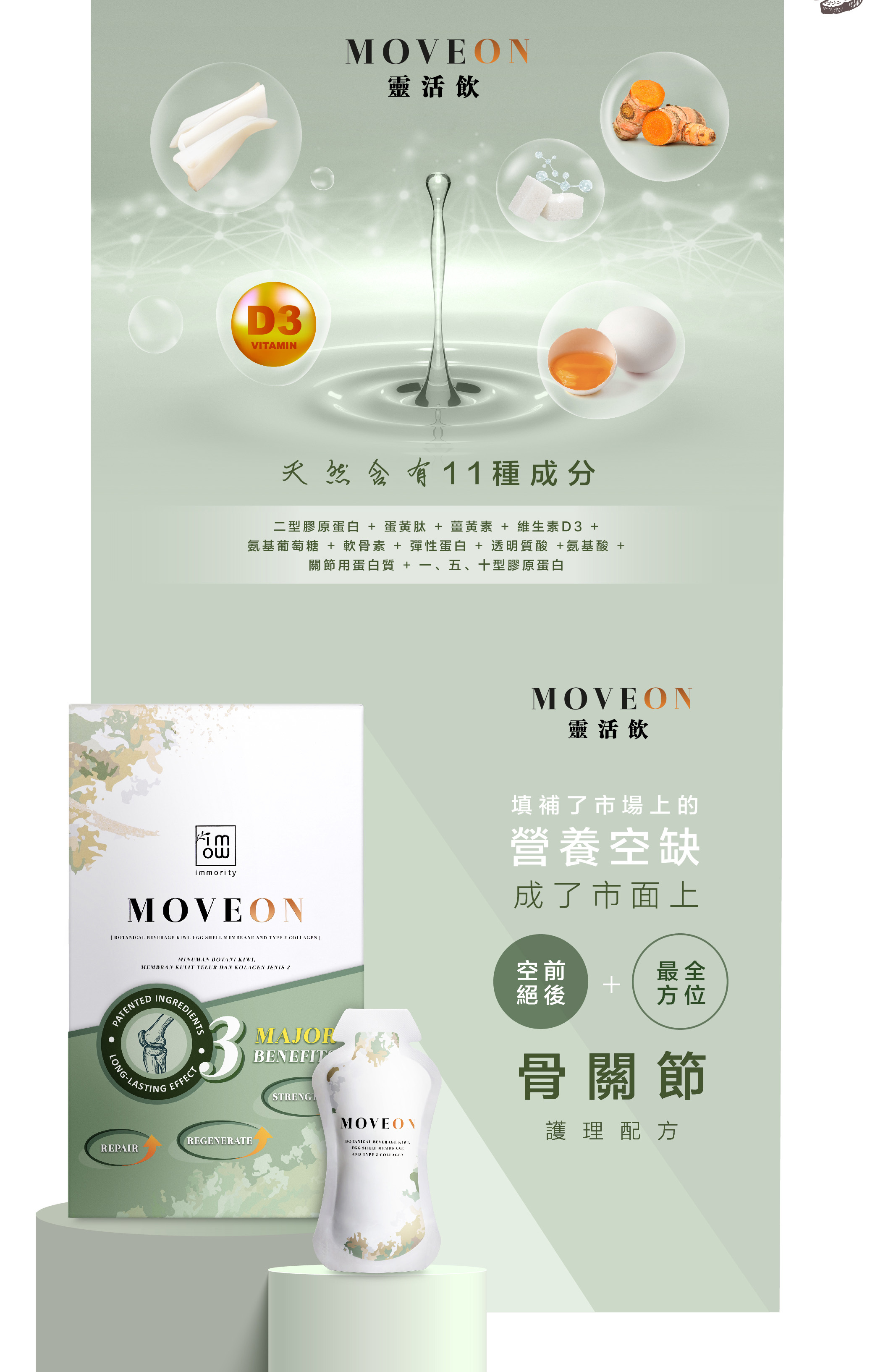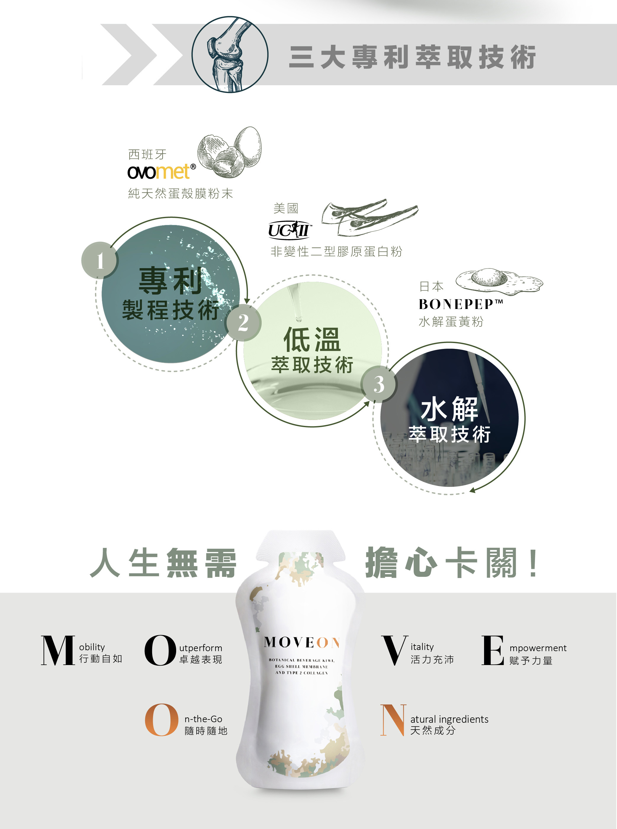 MoveOn靈活飲是21世紀突破性的關節修復飲料,含有11種全天然成分,其中3種是高 品質專利成分,是10年科學研究支持的抑制關節軟骨退化和減少關節炎症和關節不適的最佳解決方案,使用MoveOn靈活飲可恢復您的機動性。