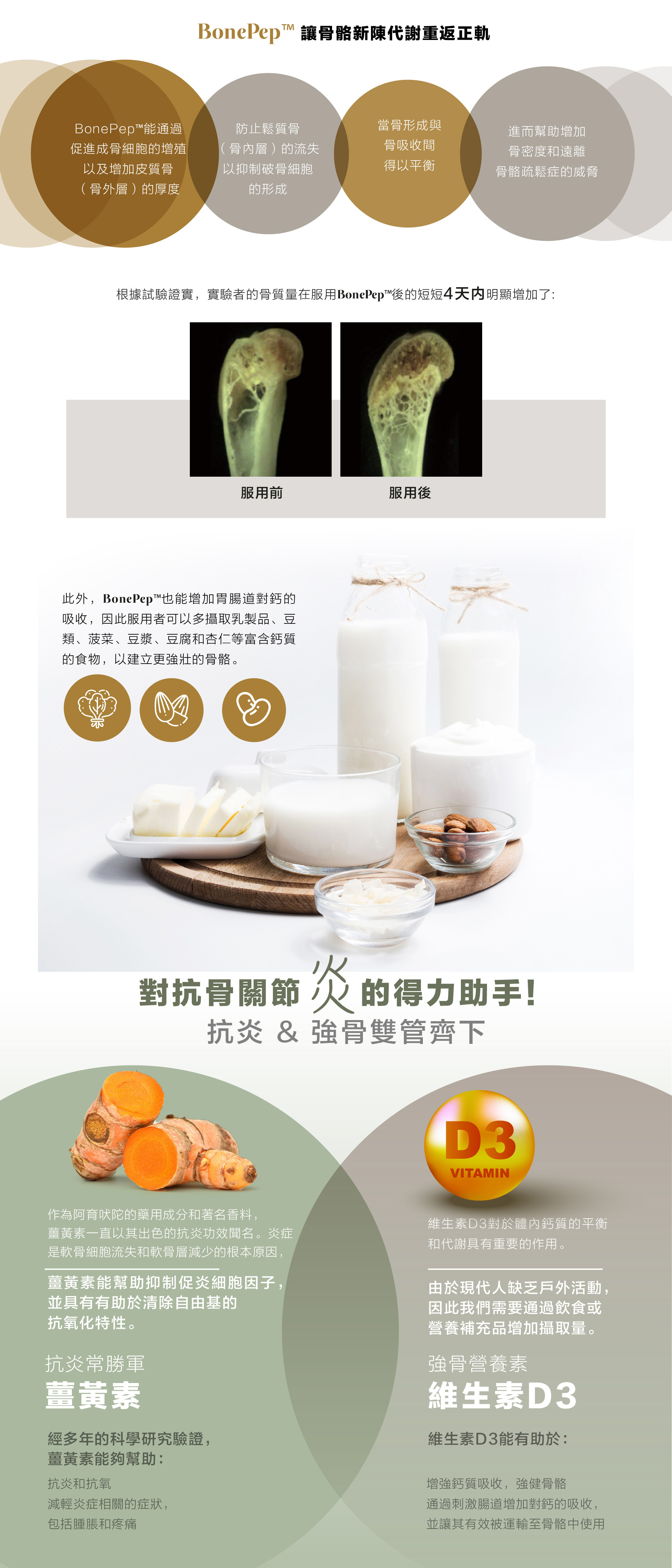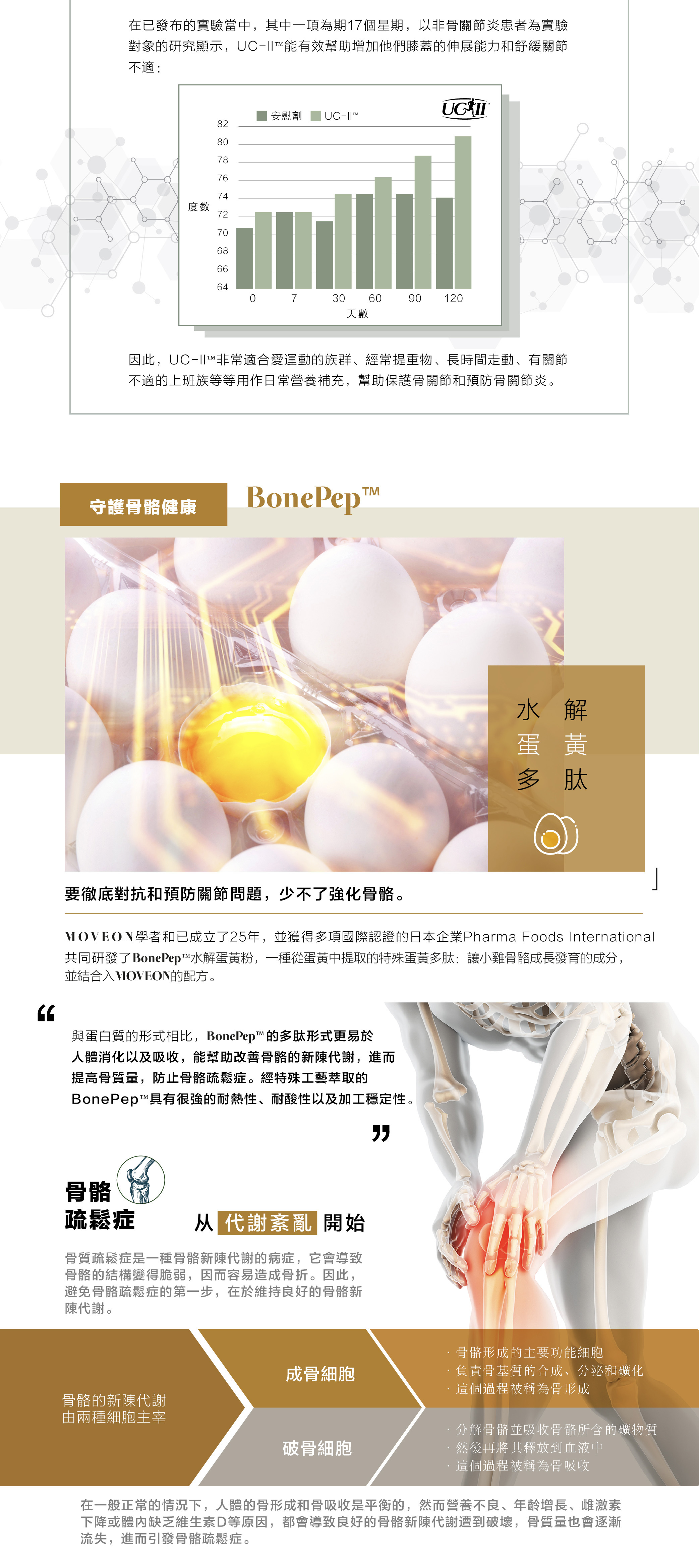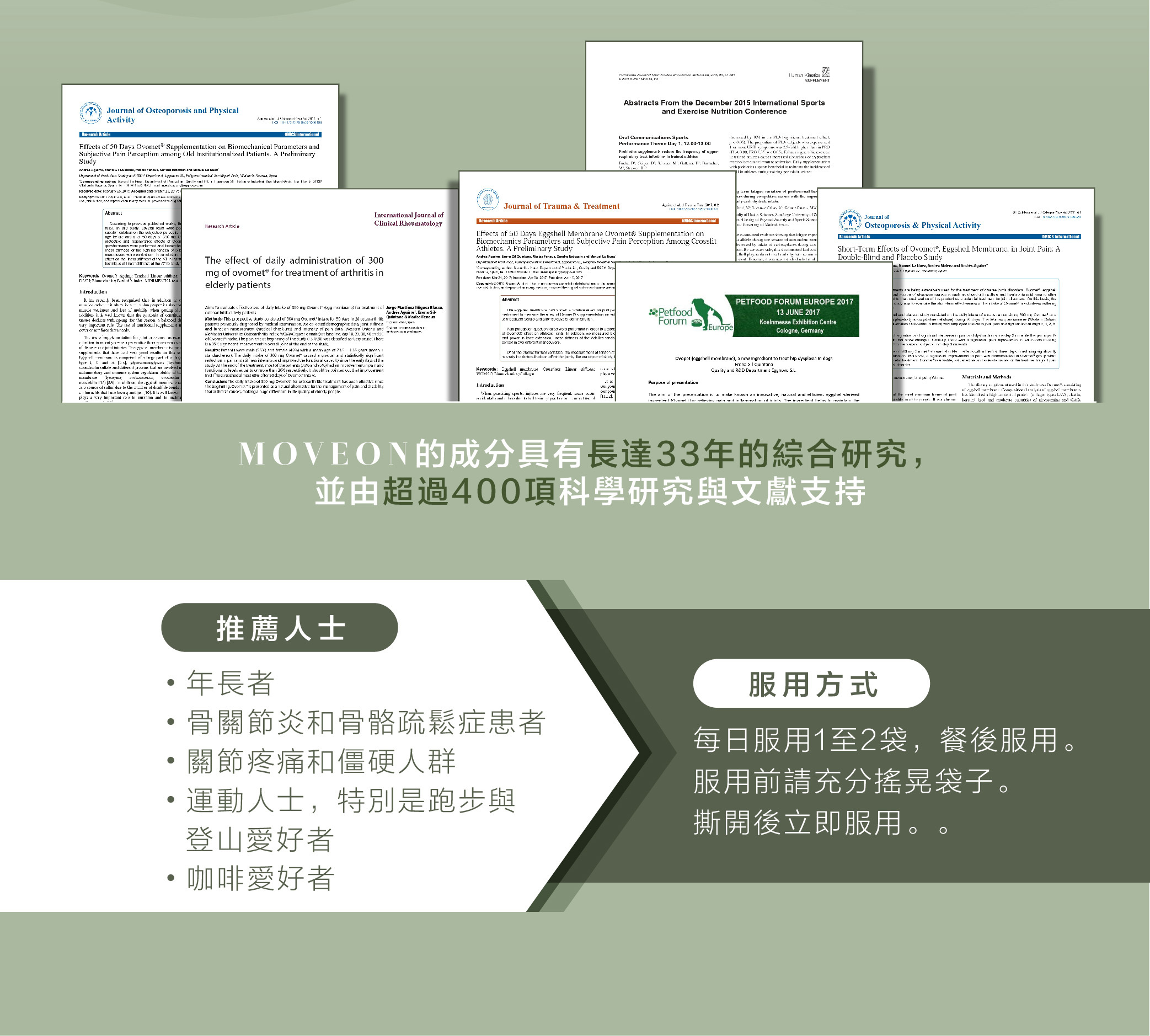 MoveOn靈活飲是21世紀突破性的關節修復飲料,含有11種全天然成分,其中3種是高 品質專利成分,是10年科學研究支持的抑制關節軟骨退化和減少關節炎症和關節不適的最佳解決方案,使用MoveOn靈活飲可恢復您的機動性。