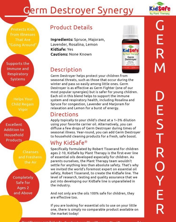 美國 Plant Therapy Germ Destroyer 細菌殺手 有機 KidSafe 精油 有助於保護您的孩子免受流感和寒冷季節發生的季節性威脅,抵抗病菌,幫助您的家人保持健康或在病中得以更快康復!它是美國 Plant Therapy 最受歡迎的產品之一,對幼兒來說更安全。配方中的每種精油都是細心研究挑選,有助於支持免疫系統和呼吸系統健康。