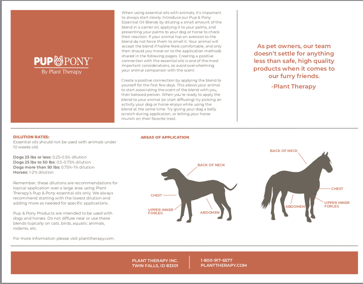 對於局部應用,可以稀釋至0.25-2%。使用有機分餾椰子油將稀釋後精油塗抹在頸部的前上部,胸部或背部。為了獲得最佳效果,在動物處於壓力情況之前5-10分鐘施用,效果更好。