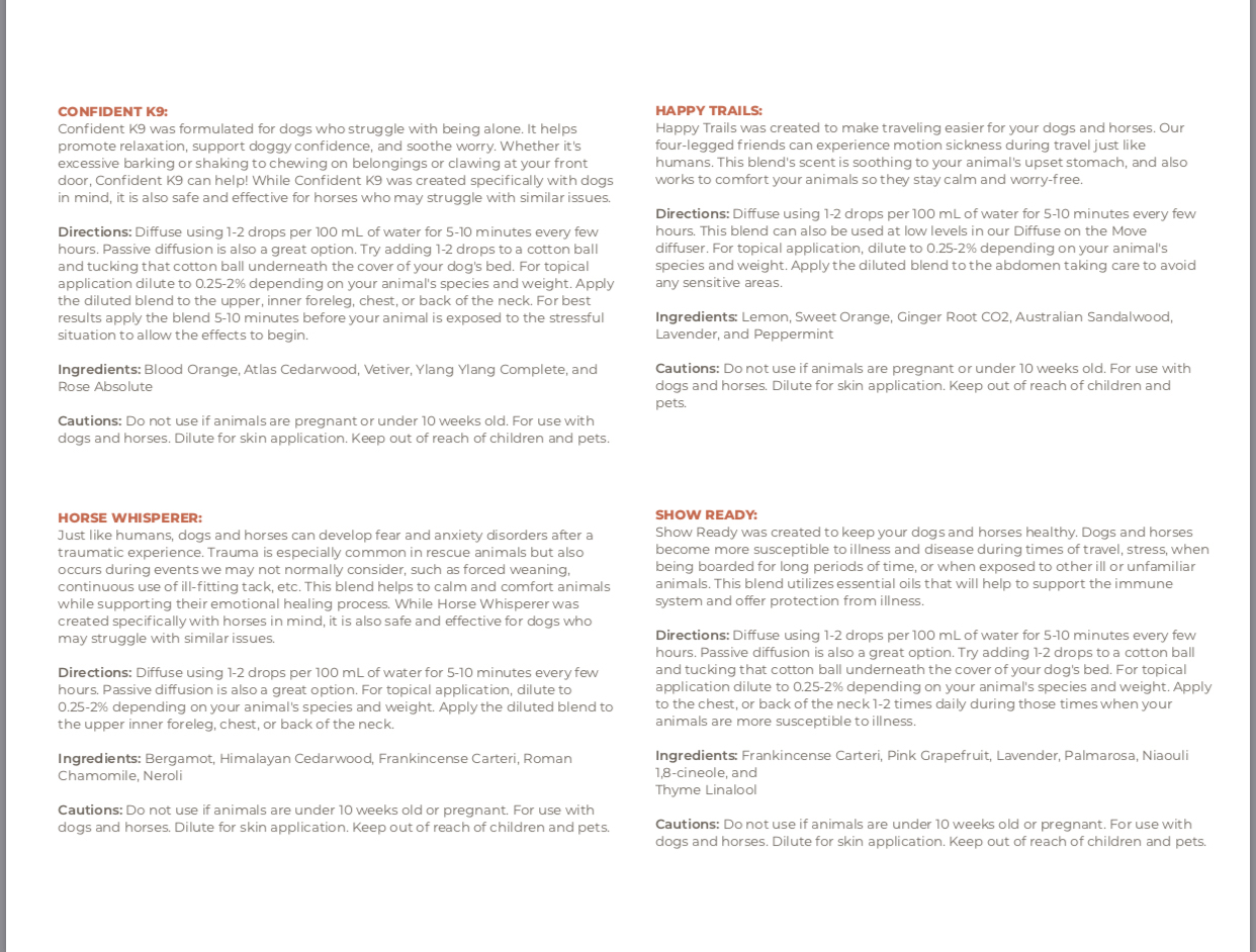 Happy Trails : 此精油幫助您的狗和馬更輕鬆。很多時候,可能會在旅途中遇到暈車浪。這種配方的香味可以緩解胃部不適,同時也能讓您的寵物感到舒適,讓他們保持冷靜,無憂無慮。