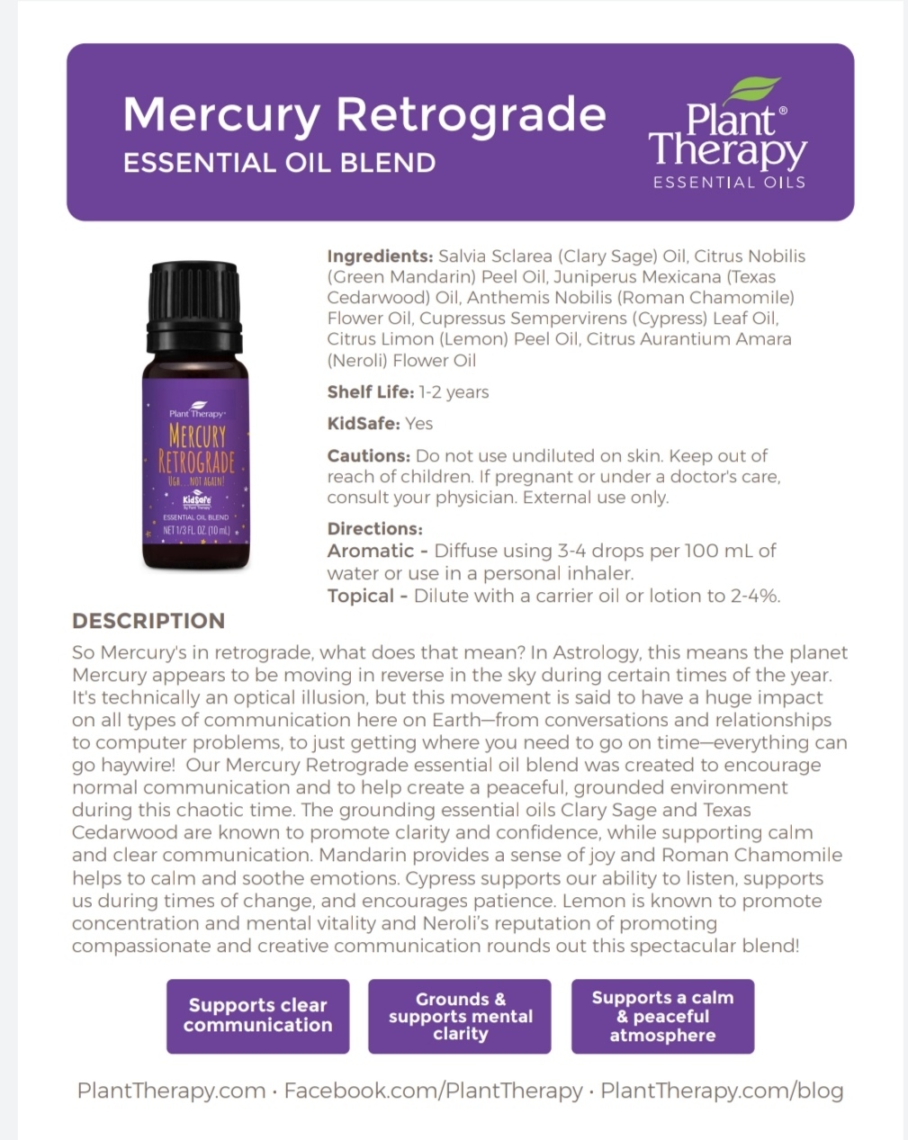 美國Plant Therapy 的👩🏻‍🎓精油專家特別為了我們設計了這款水星逆行Mercury Retrograde 複方精油,能在💫🌕水星逆行時所出現惆悵,思維混亂,猶豫不決,甚至乎生活各方面遇到的一些小問題,提供有效的幫助,更可以避免舊有情緒和遺憾所帶來的思慮和悲痛,提供各種心身靈幫助❤️