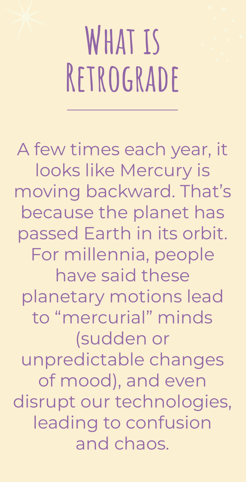 到底水星逆行是甚麼?在占星學中,這意味著水星在一年中的某些時候似乎在天空反向移動。 從技術上講,這是一種錯覺,👨🏻‍🎓占星學專家說,水星逆行會對地球上的溝通力丶邏輯力丶記憶力丶集中力甚至生活秩序都會變得不正常!這個現象其實每隔三、四個月就會出現, 而這種效果每次大約持續二十天左右,這種天文現象就被稱為水星逆行。